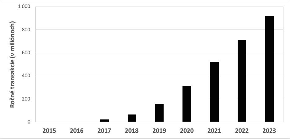 Graf: nárůst objemu transakcí provedených přes platební metodu Blik (2015-2023)